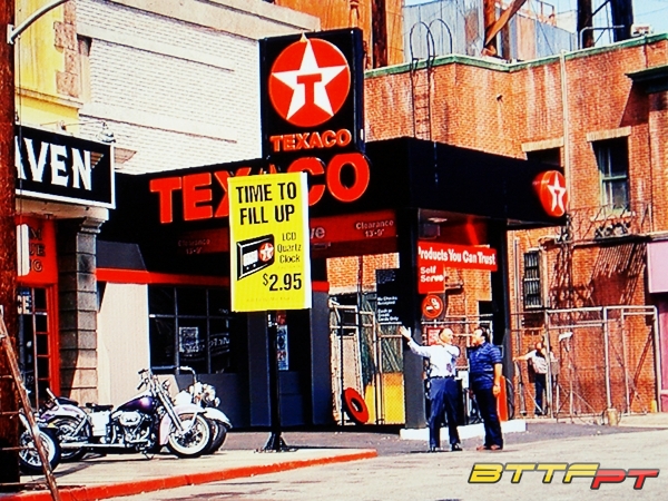 Cette enseigne non visible dans les plans tournés pour Hill Valley 2015 fait en fait vraisemblablement partie du décor remonté pour 1955 (la scène où Marty file Biff qui vient récupérer sa voiture au garage).