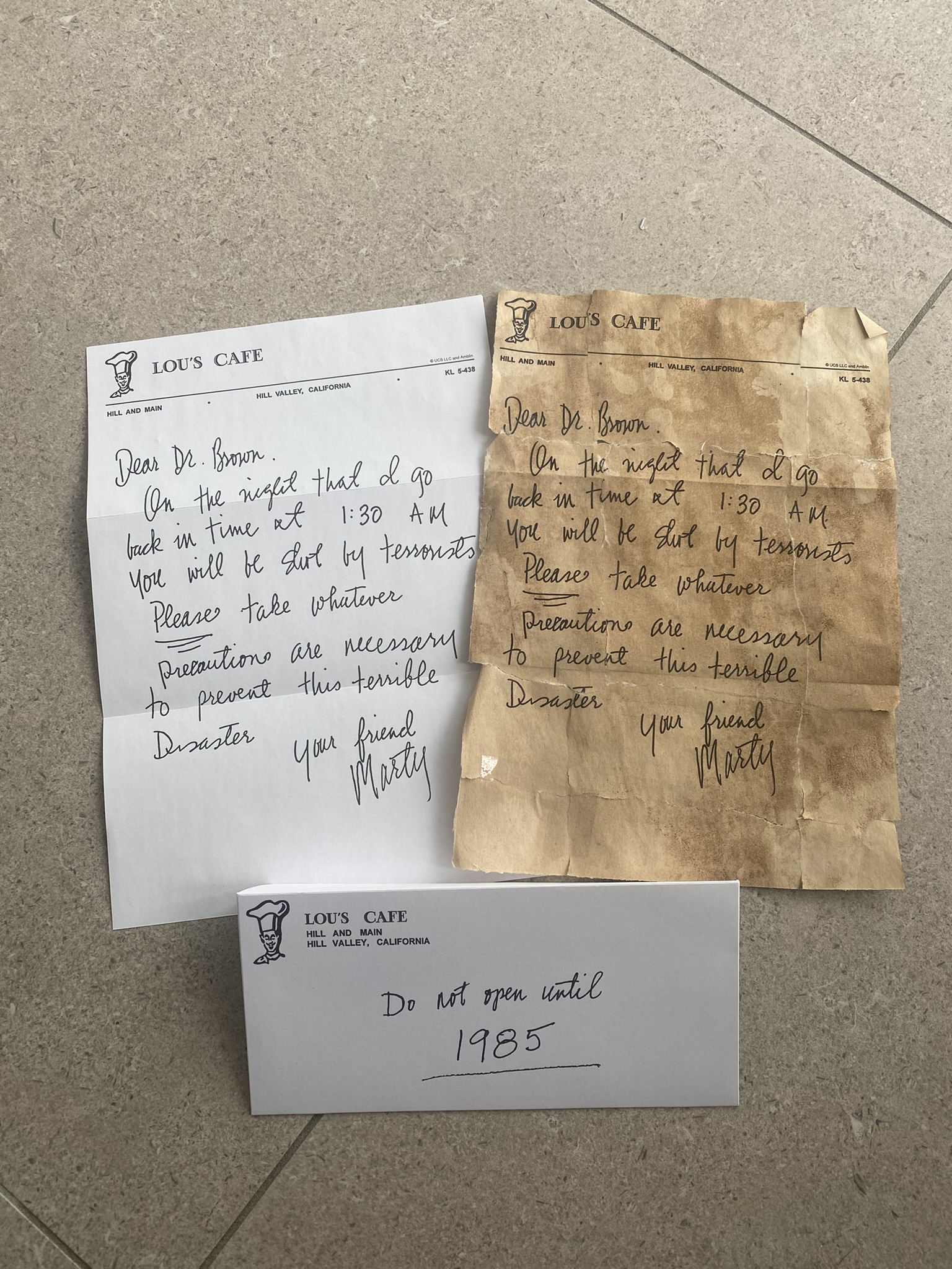 Quelqu’un aurait la lettre de Marty de 1985 non veillie ? En effet celle de 1955 et de 1985 est différente, par exemple sur celle de 1985 en dernière ligne est ecrit terrible disaster, alors que sur celle de 1955 il n’y a que disaster sur la dernière ligne.
