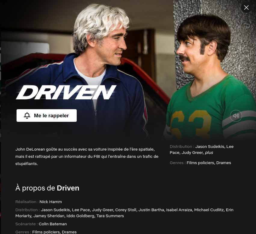 Contrairement à ce que dit la page ci-dessous, "Driven - La trahison de John DeLorean" n'est pas disponible sur Netflix ?